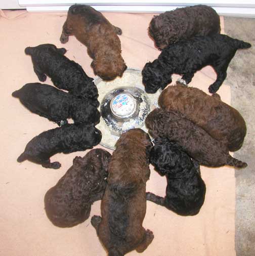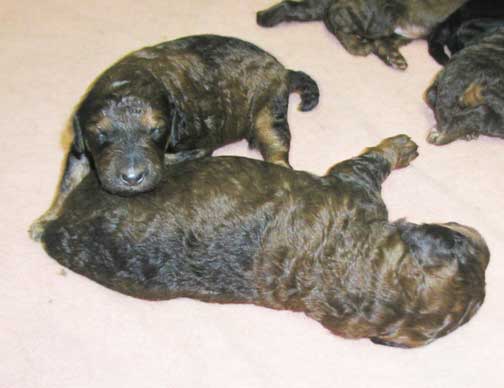 Tes keeps saying how we look like little tubbies ;o) This is the little black male female Phantom who was small, yet definitely gaining and getting a tubby tummy...she'll still be a big standard poodle compared to "standards" :o) Just small to the regular standard. I'm a black/brown female/male Phantom next to her. There's two of us with black/brown - We're HUGE promising giant size!
