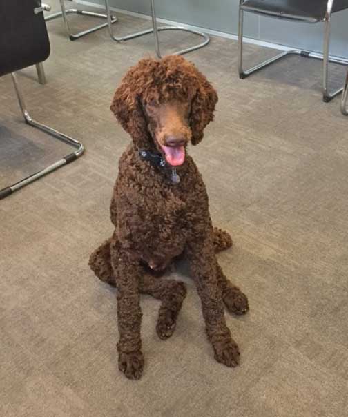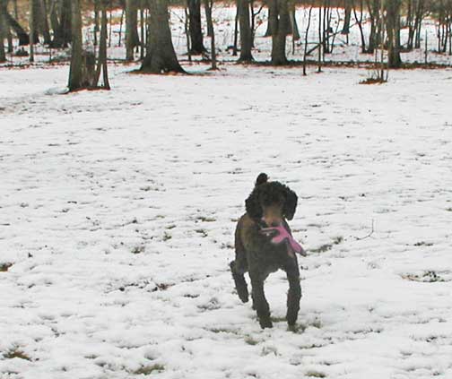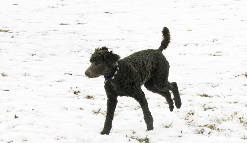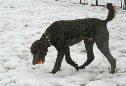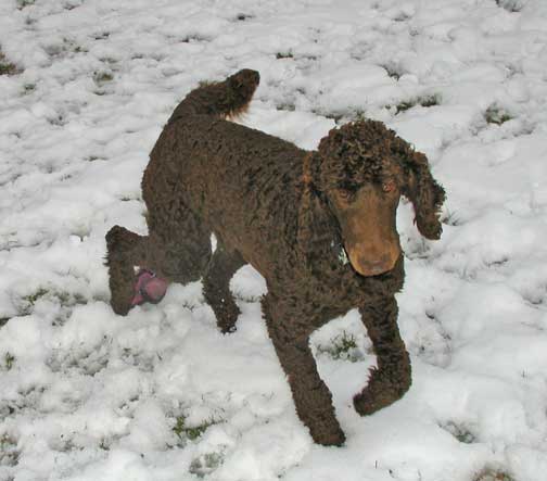 Australia Royal Standard Poodle Max is living with Tes until it's time to head home in 2 months, here going on 8 months old, learning to walk in suburbia with cars and people around and now fresh MN snow.