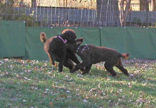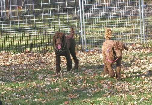 Well, we've broke out of puppy park...into momma park...I smell the dead mouse Tes threw in there! She's after us to leaaave it!! That's a pile of dirt behind us to help fill in holes in the new acre of park added. We've been watching the big spoos climb and play on it having a jolly good time!!!