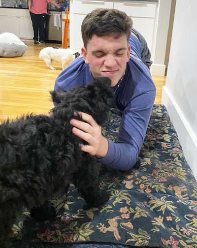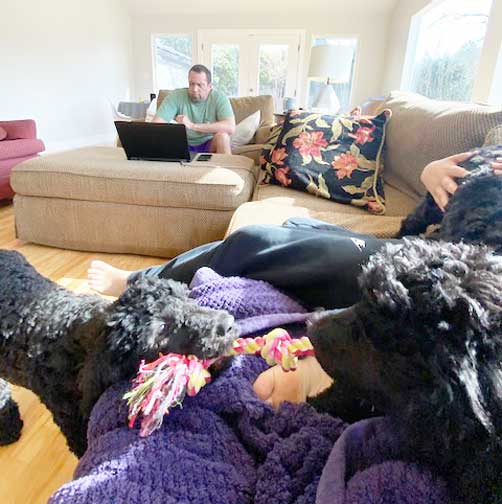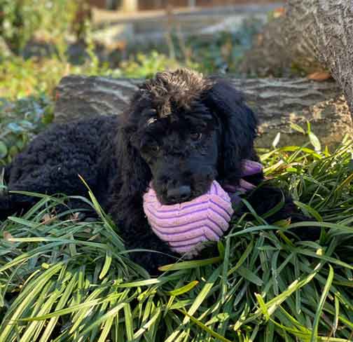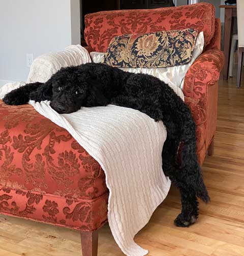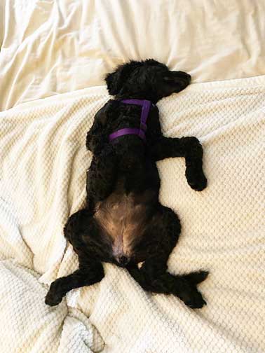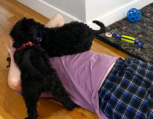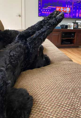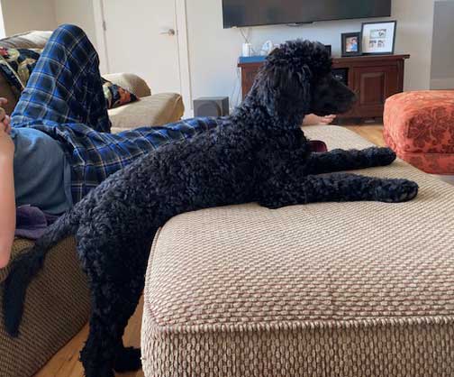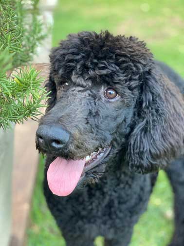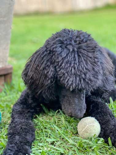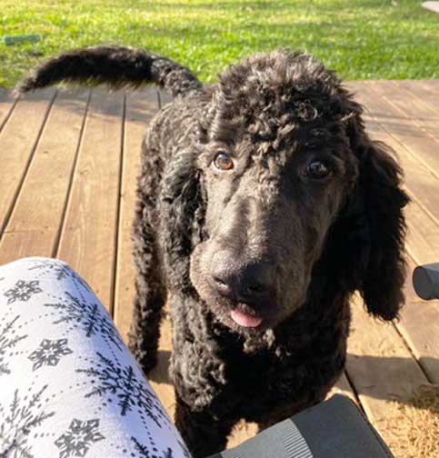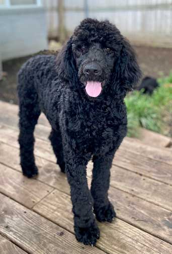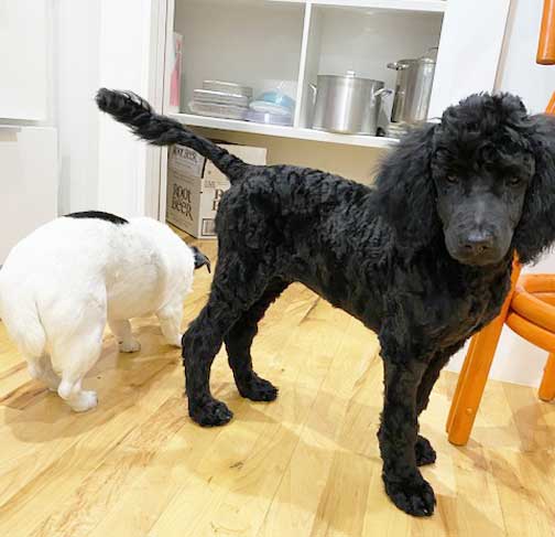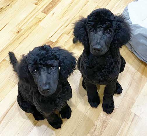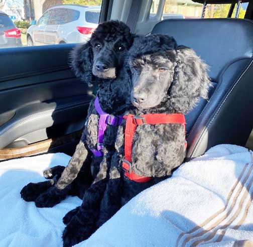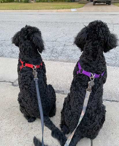 Black Royal Standard Poodles Molly Sadie sisters: Molly is 22.4 lbs and Sadie 24.6. We are working on the walks, staying next to us, not pulling us and not being scared by other dogs. They do well being calm when there are dogs behind a fence but not as well with a couple of tiny, yappy dogs on leashes. I have them sit and watch but don’t force them to go near the dogs.