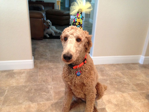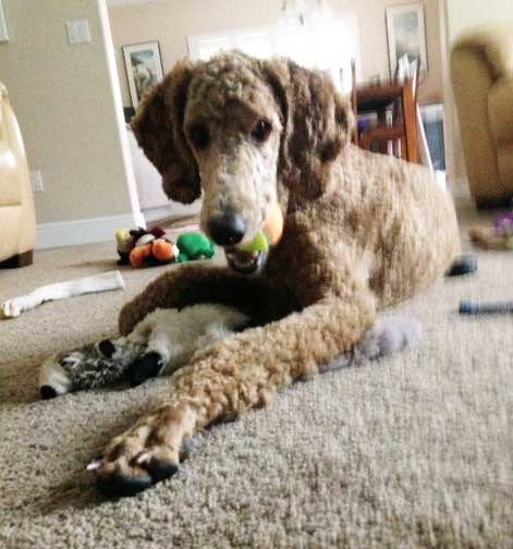 ***8/14/14 I must share - his personality is incredible! Mike & I were a little apprehensive in what to expect from him, as our Zeus was nearly human to us and we loved that and so dearly hoped Nico would be a little that way too. Well...happily Nico has exceeded our expectations! It's gotta be " big poodle " DNA, we just do not see the same behavior and personalities in our other "standard" standards.