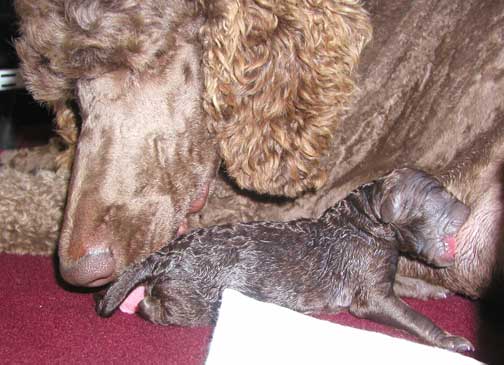 It's vital that pups begin nursing within the first hour to get their colostrum to help their immune system. The picture below, 3 new pups, the motion and nuzzling of the pups starting to nurse help bring the other pups forward to be born...and, I of course, can see their doing well in just having been born :o)
