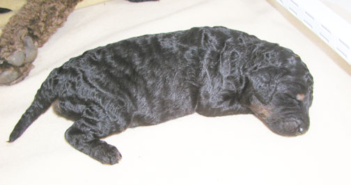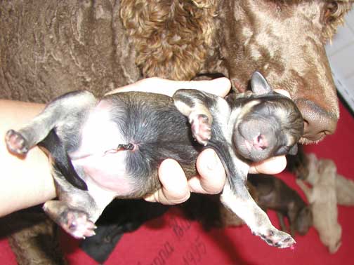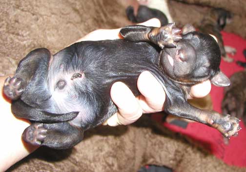 Geo had 5 Males + 5 Females = 10 - Males; 1 Black/Red Phantom, 1 Black, 1 Brown, 1 Red/Apr, 1 Cream + Females; 1 Brown Agouti, 1 Black, 1 Brown, 2 Cream I will be watching for any umbilical hernias in the coming weeks, some don't show up until 5 wks old. If found I may decide to repair around 6 wks of age, where pups are ready and healed by going home. If NOT large, I prefer customer to do...best to have repaired when getting pup fixed (if needed, could close on it's own).
