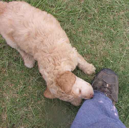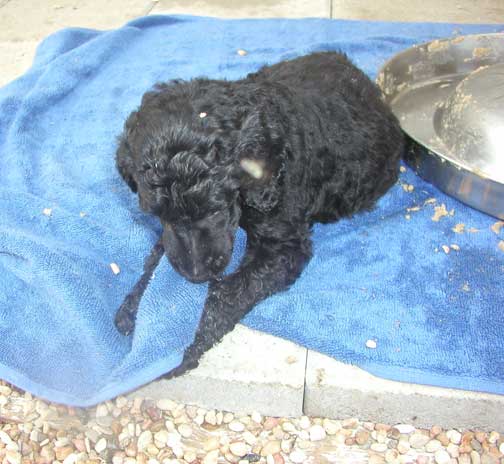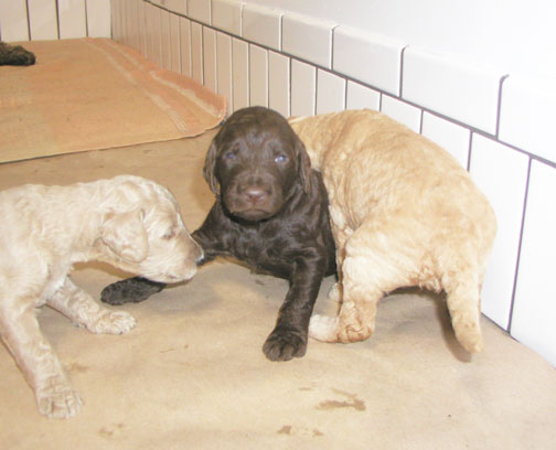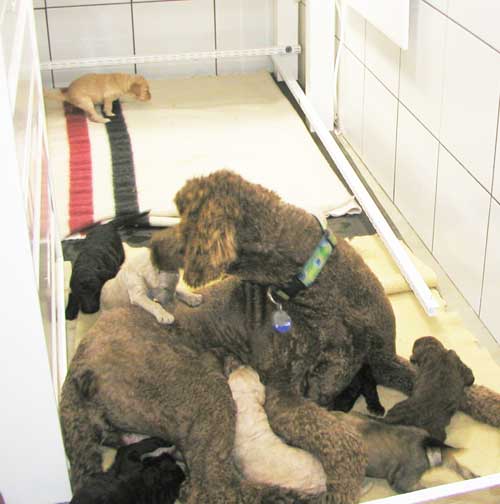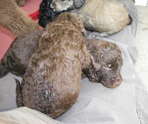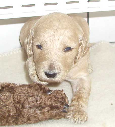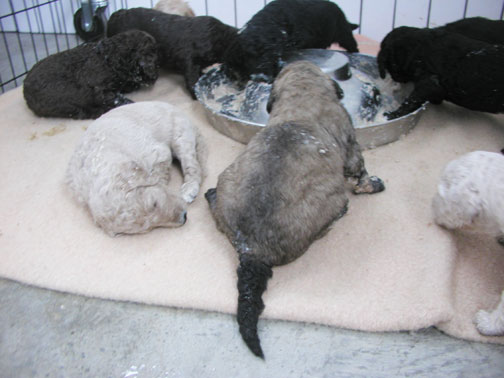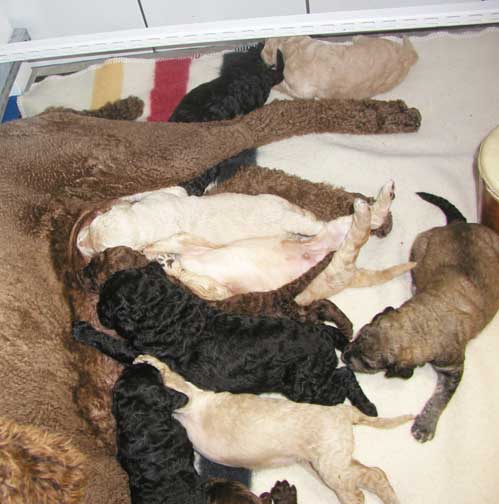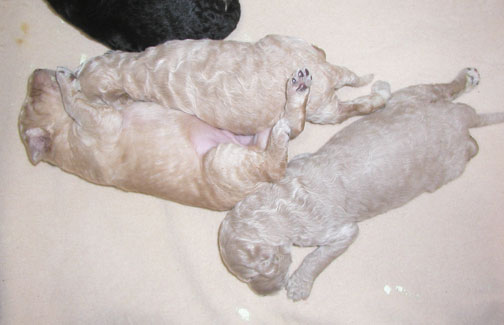 I haven't ever mentioned this before, yet find it of interest to share now...the importance of the wool blankets or sturdy paper underneath the puppies...without these items for their nails to grip, they start "Swimming" trying to push in and hold position. This has literally been given the name to puppies who cannot stand on their own after weeks of nursing, without something to grip them, they're called "Swimmers" :o( So, I've found the wool blankets ESSENTIAL to my protocol of raising my spoos.