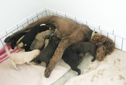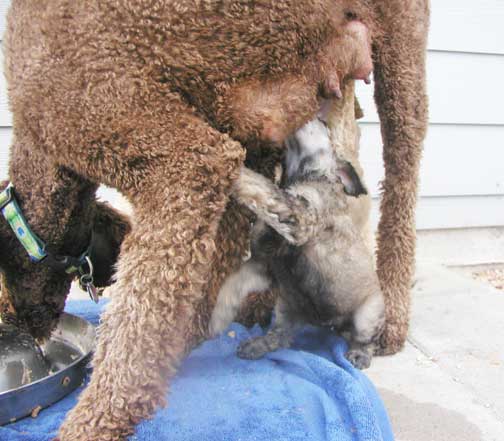 Momma Geo is doing great and has good milk for them. When I occasionally need to pull a pup off from nursing, the milk pours out of their mouth, thus I see she's doing great as are they...and I am always checking teets to assure they're all being taken down so mastitis doesn't occur.