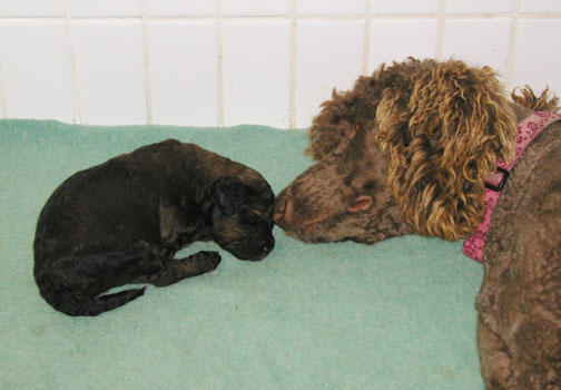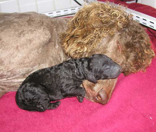 Magic's licked clean her first puppy of 8 :o) Already taken to the nipple, their first sense at work, smell! As we came early, Tes will wash and shave Momma down next.
