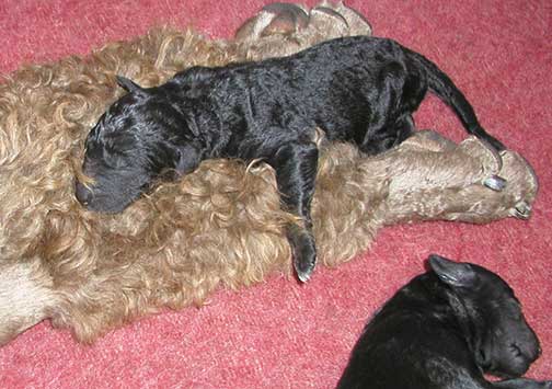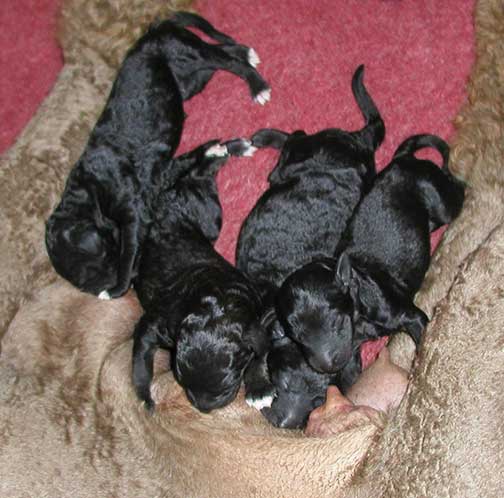 Here we have a small puppy pile...zzzzzz....see the puppy on the left...that female has brown around her legs and would be what I understand to be an Agouti colored pup, brown with black tipping, there are two of us as you'll see Tes point out.