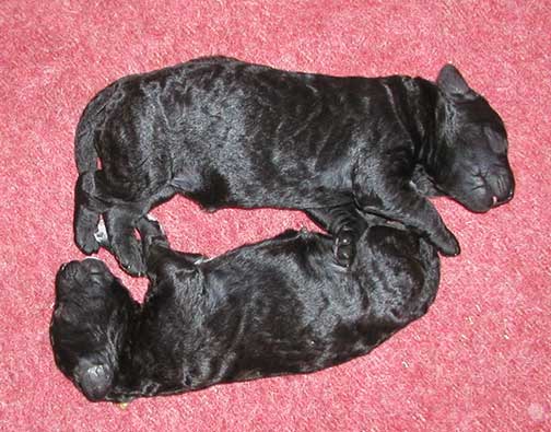 See what little tubbies we are :o) 4 legs up, or down, we're keeping nice and warm with full tummies. Some of us are black with white in our toe pads and some of us have white abstracts on our chest, on our toes, and on our chins.