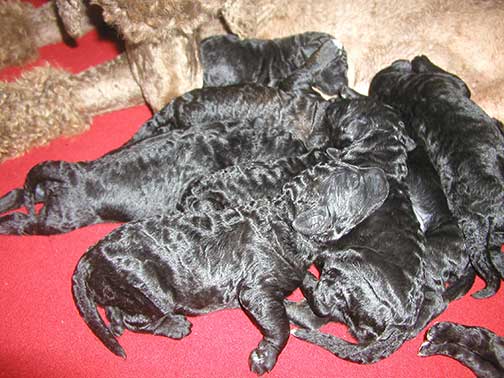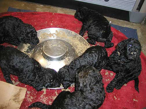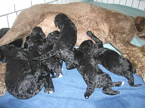 The next 3 wk picture update above for our web page Royal Standard Poodles MxE will show our eyes opening and starting to stand and move around...making a lot more music for Tes. Definitely getting ready to move into the Wing with 11 of us by 3 wks old :o) Stay tuned...