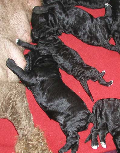 A litter of ALL Black or Blue puppies (turning to a steel gray as adult) with some having white mismarks on toes, chest, or chins...and one white tipped tail from Royal to Standard Poodles MxE.