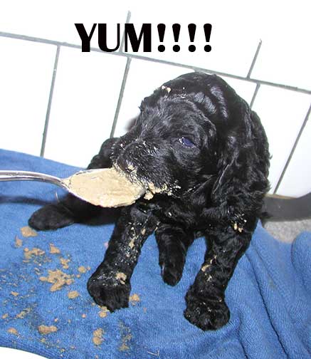 As we grow so fast, we're starting to get hungrier and needing more nutrients to not drain momma. Tes makes us up a slurry made from Purina puppy Mousse, thins it out with water and adds dried ground lamb dog food. She likes Health Extension Lamb kibble to get our sensitive tummies going. Over 16 yrs of breeding, this has become the protocol to avoid diarrhea from just the canned mousse (ALWAYS had diarrhea with only canned) then in adding the dried grounded kibble it made their stools nice that they no longer have swollen sensitive anal areas from the loose stools irritating them. SOOOO MUCH healthier!