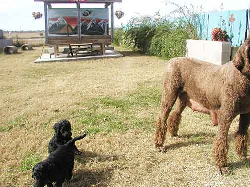 HEY LOOK! We've reached to the back of the Puppy Park!!! Tes has her mural she painted of a scene from her fantasy book, first of a trilogy, "A Perfect World" . She painted it on her garage door in MN and brought it to TX. It's a great canopy for us to stay cool from the hot TX sun in the summer. She names her spoo parents from characters in the book and some customer names will be in the upcoming trilogy as characters...having fun with life and all that she brings to you :o)