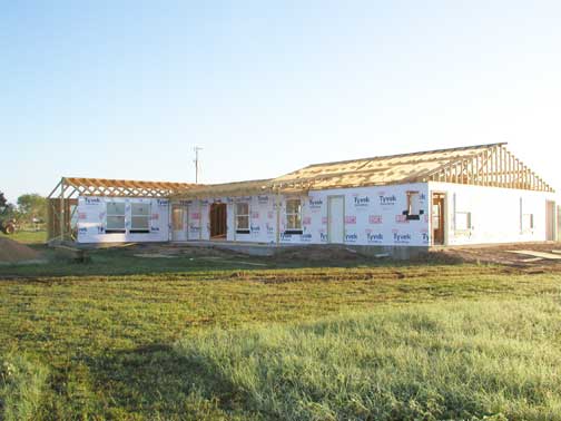Sealing the house with Tyvek, then I spray the inside walls with Cedar oil "Petri-Wood" to prevent bugs from enjoying themselves...the healthy alternative to chemicals when building a house in TX. Purchased from Dr. Bens Cedar Oil company here in TX...yes the same company I purchase the cedar oil to spray and protect our spoos from bugs in MN