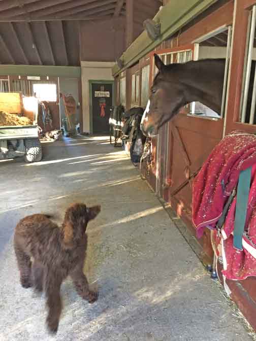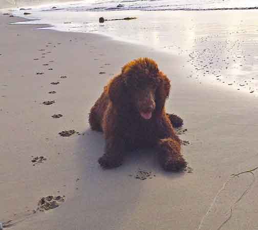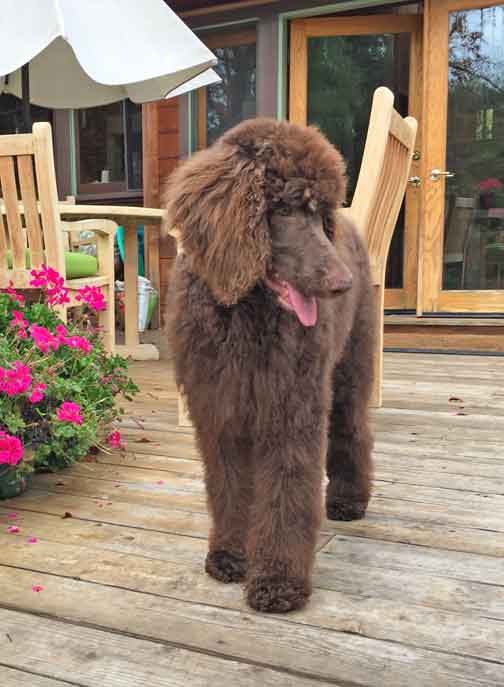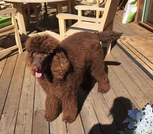 Royal Standard Poodle Brown Matilda at home in Makibu, CA. Daughter of parents Jasper x Daniel 2016.