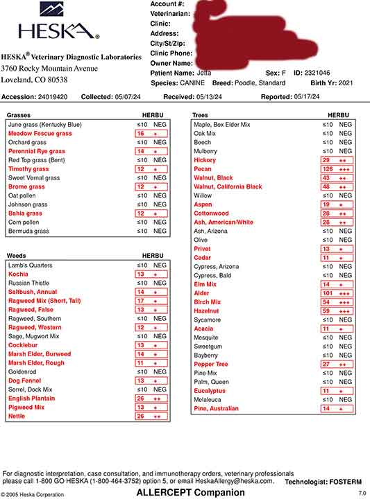 Standard Poodle Allergies - Jetta, above as a pup, now an adult. Her owner has been excellent in chiropractic care, top notch healthy food, and training to be a great pet, and as owners, GREAT owners! There was itching and situations that led owner "J" to pay $500 to receive an allergy test for her. J has given written permission to write about Jetta and share her data below.