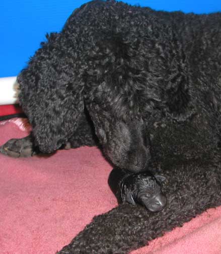 Zeddy's puppies are a day old, still have their tails, and she is being very loving by being the instinctive Momma by licking them as they can't potty normally on their own without licking to stimulate the function.