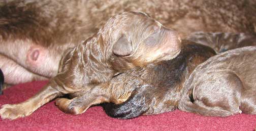 Above, puppies are 1 day old. Angel is tired yet loving her pups. We all 8 came from her tummy just yesterday!!! We're excited to come home to you :o) Ahhh, yes, snuggle, cuddle, look at us little tubbies at just a day old...