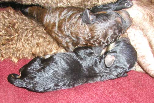 Tes keeps saying how we look like little tubbies ;o) This is the little black male female Phantom who was small, yet definitely gaining and getting a tubby tummy...she'll still be a big standard poodle compared to "standards" :o) Just small to the regular standard. I'm a black/brown female/male Phantom next to her. There's two of us with black/brown - We're HUGE promising giant size!