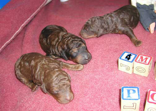 Our tails are docked and due claws done now. Tes waits until we're doing well with some ounces gained...usually 2-3 days old they get done. Our bones start to get harder each hour and day that goes by...when done early there is VERY little pain initially...each day that goes by, Tes can tell with the different litters at different days as we cry more at 3 days then those at 2 days...1 day is done if of good weight and it's just the way it has to be to get into a placement at the vet's.