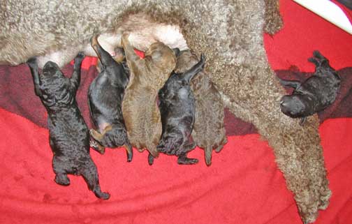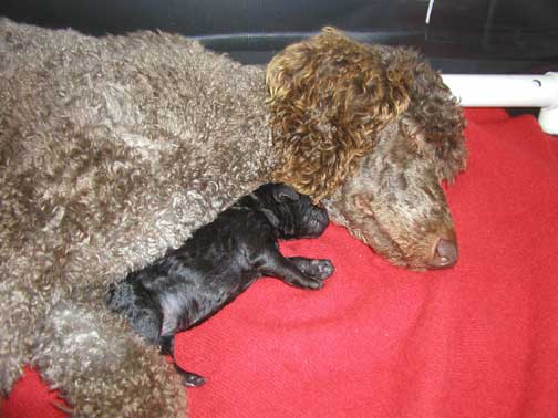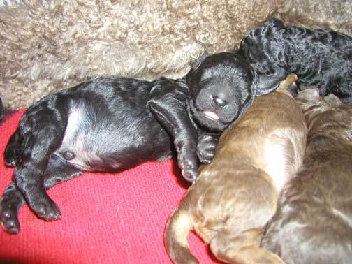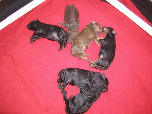 Above, puppies are 1 day old. Angel is tired yet loving her pups. We all 6 came from her tummy just yesterday!!! We're excited to come home to you :o) Ahhh, yes, snuggle, cuddle, look at us little tubbies at just a day old...