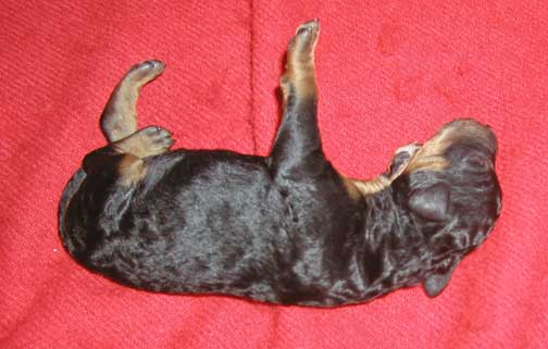 Our tails are docked and due claws done now. Tes/Dani waits until we're doing well with some ounces gained...usually 2-3 days old they get done. Our bones start to get harder each hour and day that goes by...when done early there is VERY little pain initially...each day that goes by, Tes can tell with the different litters at different days as we cry more at 3 days then those at 2 days...1 day is done if of good weight and it's just the way it has to be to get into a placement at the vet's.