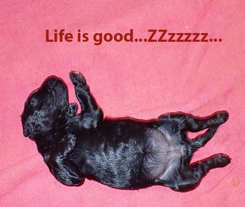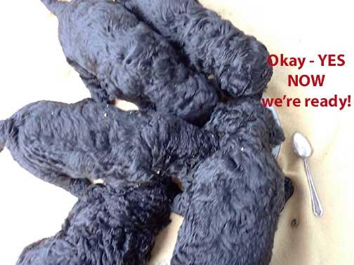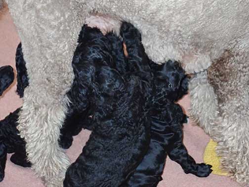 The next 3 wk picture update for our web page Black Royal Standard Poodles will show our eyes opening and starting to stand and move around...making a lot more music for Tes. Definitely getting ready to move into the Wing with 6 of us by 3 wks old :o) Tes will provide microchip numbers of each of us at 3 wks old so you can then start to see our differences.