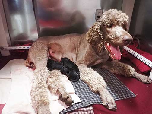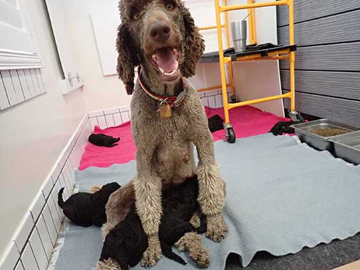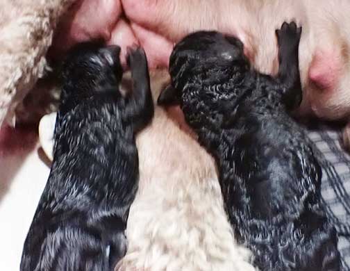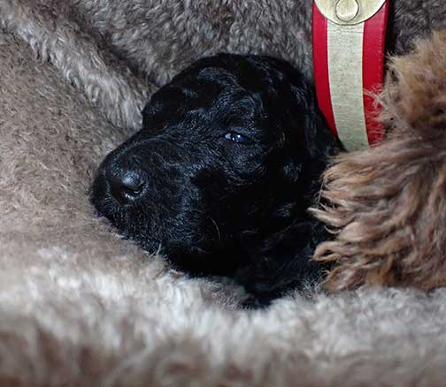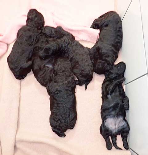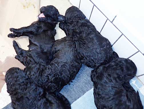 Black Royal Standard Poodles - Brown Cairo x Black Holiday have brought us some magnificent ROYAL pups. Definitely born of Royal size. DOB 6/24/22, ready for homes 8 wks later Friday August 19, 2022. Start at the bottom of the page and watch them grow up as pictures are taken in the coming weeks of growth.