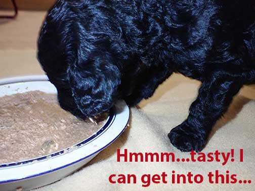 As we grow so fast, we're starting to get hungrier and needing more nutrients to not drain momma. Tes makes us up a slurry made from Purina puppy Mousse, thins it out with water and adds dried ground lamb dog food. She likes Health Extension Lamb kibble to get our sensitive tummies going. Over 18 yrs of breeding, this has become the protocol to avoid diarrhea from just the canned mousse (ALWAYS had diarrhea with only canned) then in adding the dried grounded kibble it made their stools nice that they no longer have swollen sensitive anal areas from the loose stools irritating them. SOOOO MUCH healthier!