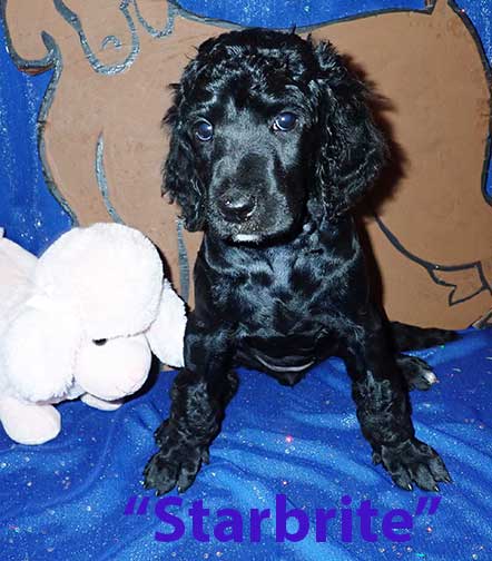 SOLD - "Starbrite" - 7 wks old mc 0388; 11lbs 15oz; Black with white mismarks on chin and back toes. I get to go home to where there is another Spoo and pet to help me grow and learn KM > Kerville, TX. Starbrite shines out among the litter with her unique highlights. She is going to brighten the life of any family :o)