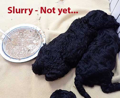 We're growing, growing, growing, drinking water and eating dry kibble as much as the slurry, and now at 5 wks old even less slurry.