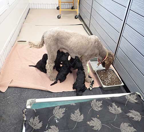 Wool blankets are used to wick away moisture and keep them dry and warm. Tes has a variety of colors, to make a more colorful page for you ;o) An electric pet heater is under the upper back right corner to keep us pups in an even warmer area for the first several days. Such scooters we are.