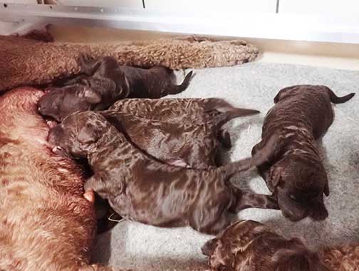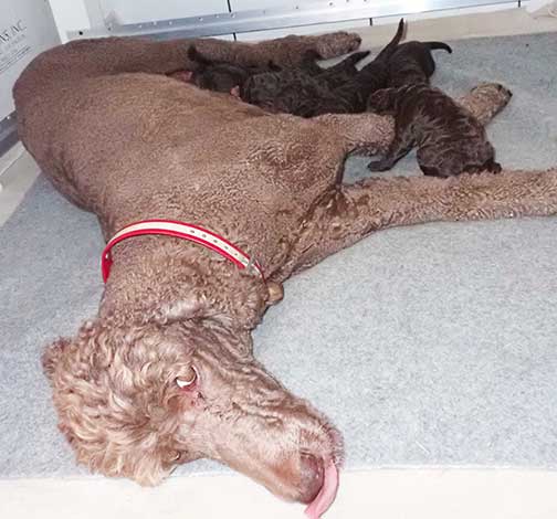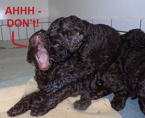 Brown ANGEL puppies just coming into the world as TI helps Momma Geo along the way. They instinctively head immediately to the smell of a teat and start nursing. Momma has LOTS of milk for her 6 pups.
