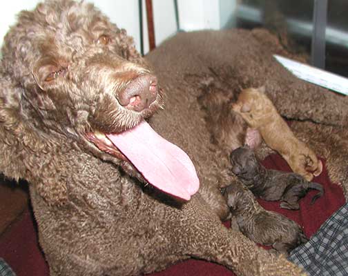 Geo x Bruno x Draco Royal Standard Poodles dual sire litter. Pups arrived! DOB 10/4/21. Woo Hoo - Bruno frozen semen came through for us! Not a large litter, yet Bruno customers will be happy - 5 Brown Males + 1 Red Female = 6 pups :o)
