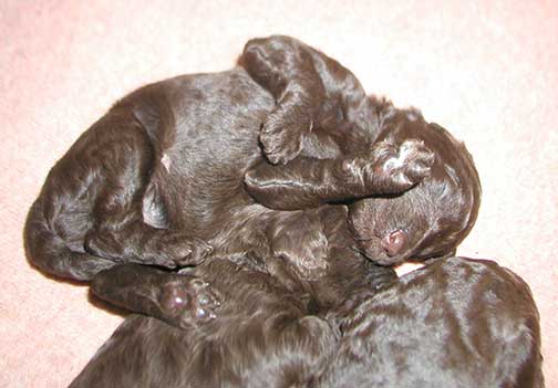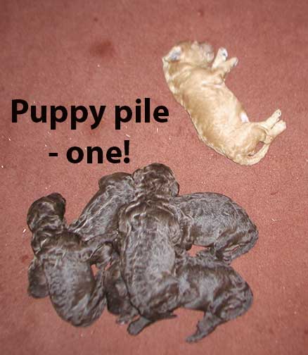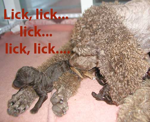 Here we come! Already trying to sniff out that nipple to start suckling as we dry off. Tes is always amazed how fast we go to find a teet and start suckling. Tes was going to groom me down today to be cool when I started whelping, she'll clean me up tomorrow :o)