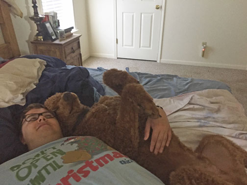 Red Ranger and Phantom Louise sharing? a bed.... Yes, there is another whole empty bed off to the right, and hey, what's better than two Large Standard Poodles curling up together?