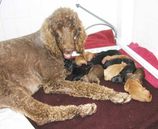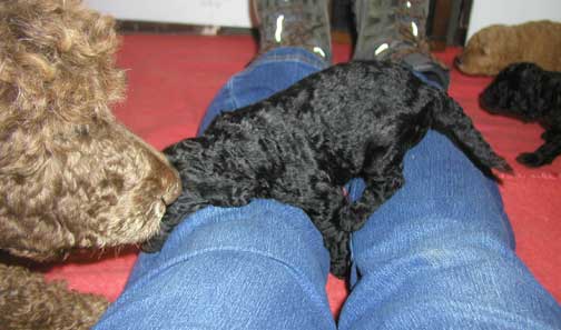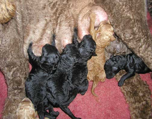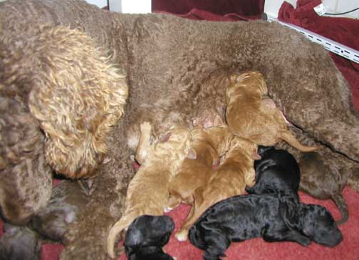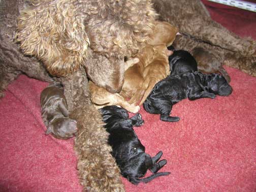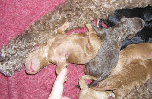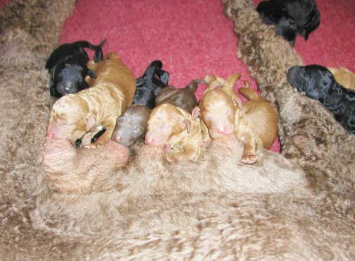 Large Standard Poodles MxD wtr 2019 - Magic had 5 Males + 6 Females = 11 > Males; 2 Black, 1 Red (Tes keeping), 1 Apricot, 1 Brown + Females; 2 Red, 3 Black, 1 Brown I will be watching for any umbilical hernias in the coming weeks, some don't show up until 5 wks old. If found I may decide to repair around 6 wks of age, where pups are ready and healed by going home. If NOT large, I prefer customer to do...best to have repaired when getting pup fixed (if needed, could close on it's own).
