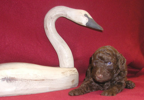 SOLD; "Swan" mc 4965, 8 wks old 9.4 lbs. I'm now home named "Birdie" and at home with ES > Dallas, TX. I'm a solid brown female. Ugly ducklings turn into gorgeous swans. I'll turn into a gorgeous Royal Standard Poodle for you :o))) Cygnus is a northern constellation lying on the plane of the Milky Way, deriving its name from the Latinized Greek word for swan.