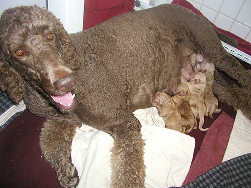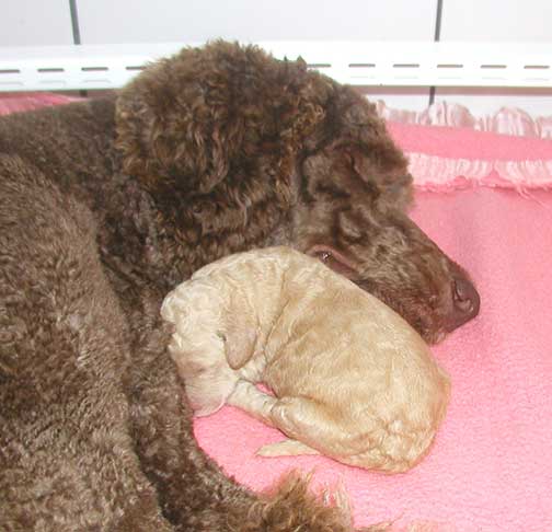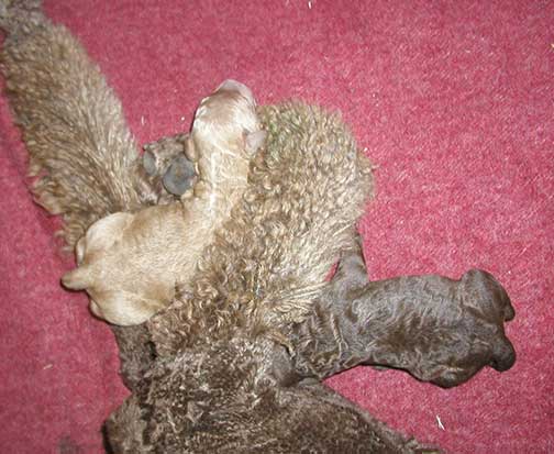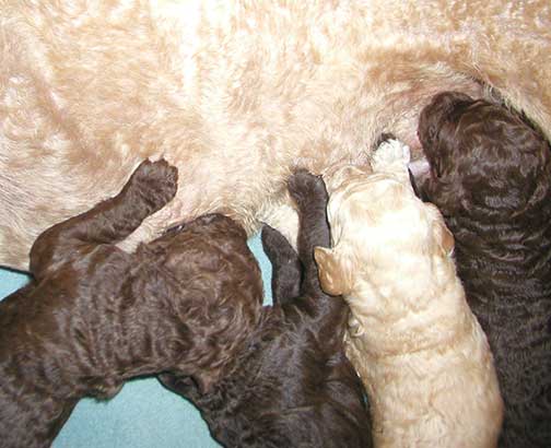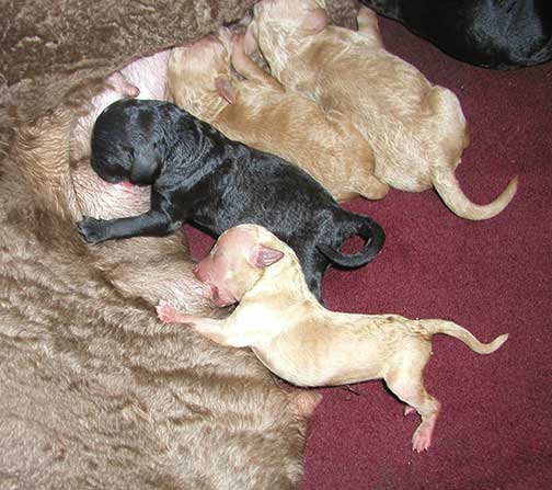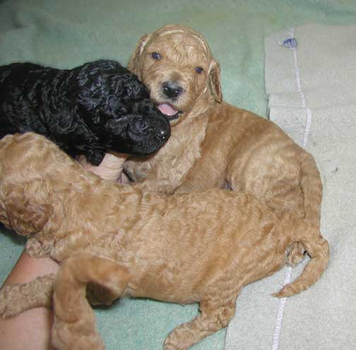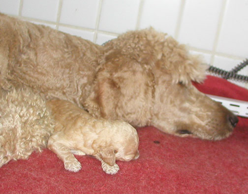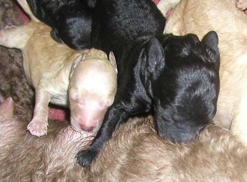 In raising Large Standard Poodles GxD Puppies, Tes hopes to share a bit of what she does to bring you your next pet :o) The bedroom must be heated to 80-90 degrees as pups just come from the womb and they have no way to monitor their bodies being just born, especially the first week Through the Woods of Mother Nature. Here are several of us just born, already latching on for our first drink of colostrum, rich in antibodies.
