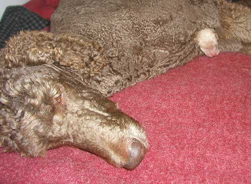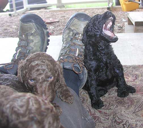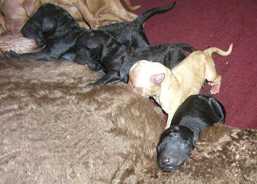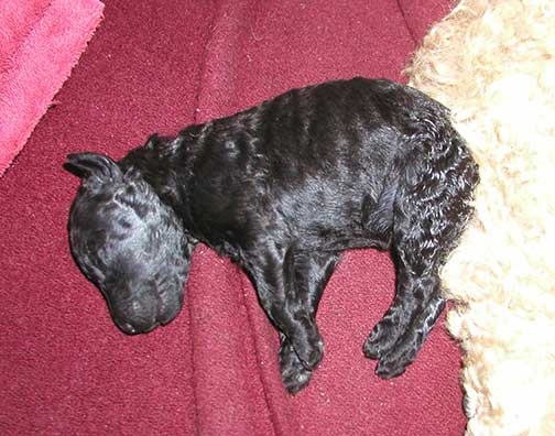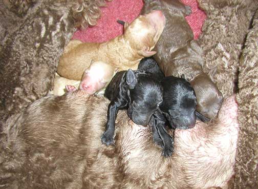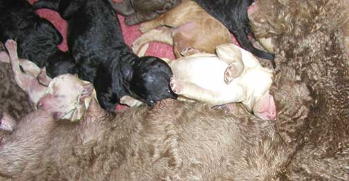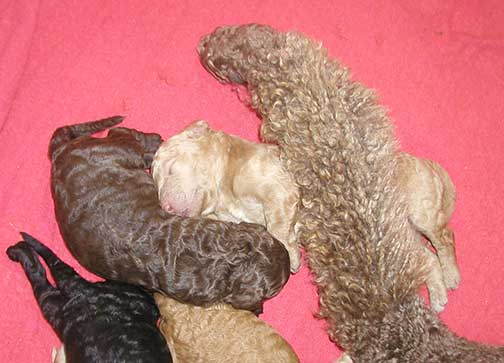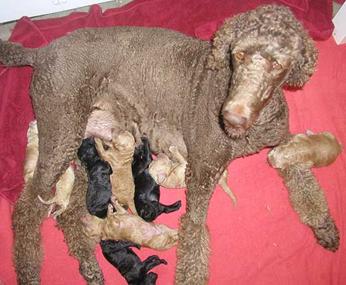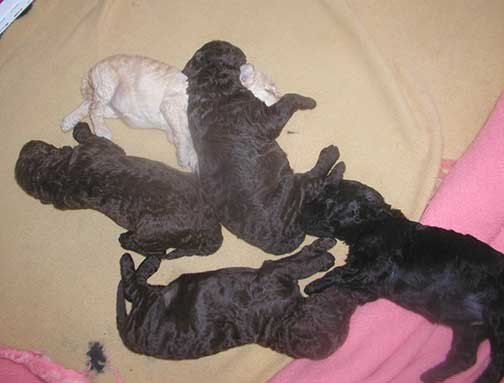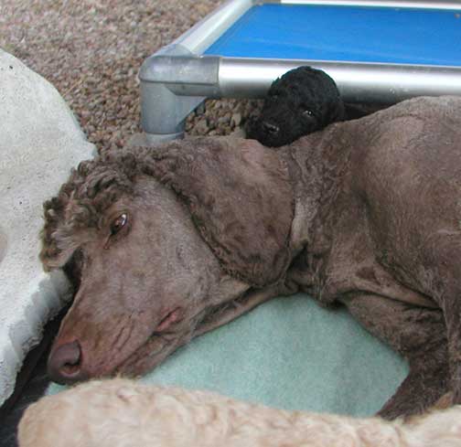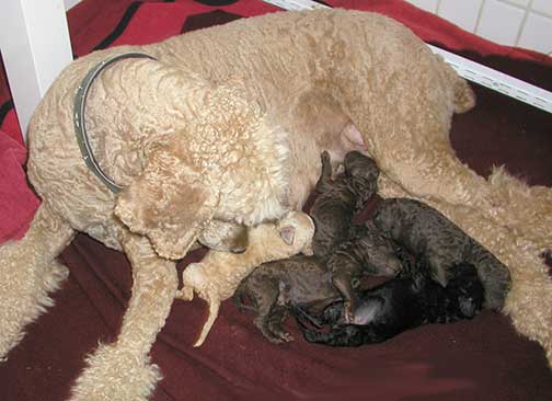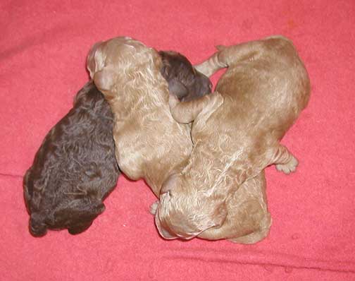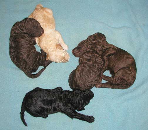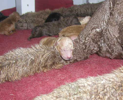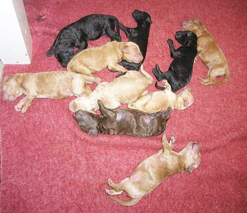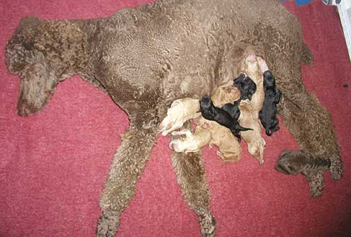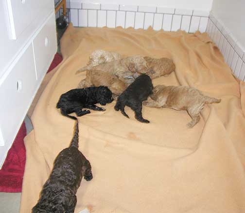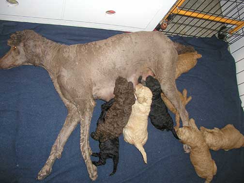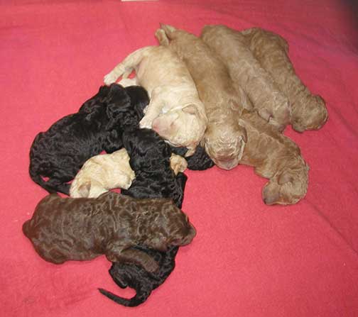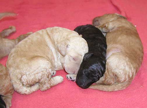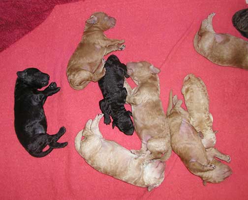 A range of color from black, brown, red, apricot to cream, from Large Standard Poodles GxD to standards. Having lots of room for momma to circle around us is important. Some of us nurse, some of us zzzzz....