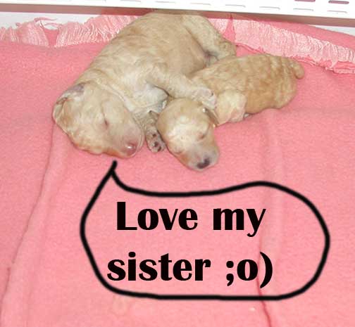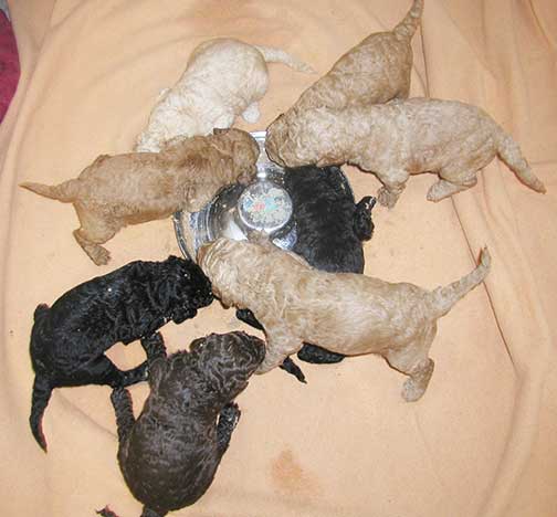 Two of us Females are almost half the size of our brothers and sisters. We'll more then likely be "Standards". Tes has named the smallest Apr/Crm Female "Sage" and the smallest Black Female "Lavendar". The rest of us won't get named until 3 weeks of age when our individual pictures are posted. Sage and Lavendar are digging right in their though like the rest of us! It's not uncommon with such a large litter have several so small.