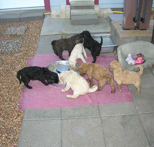 Remember to start at the bottom of the web page and scroll up to watch us Large Standard Poodles GxD grow up onto the page, as pictures are added upward every two weeks :o) Tes does her best to share what is done as a breeder in growing us up for you.