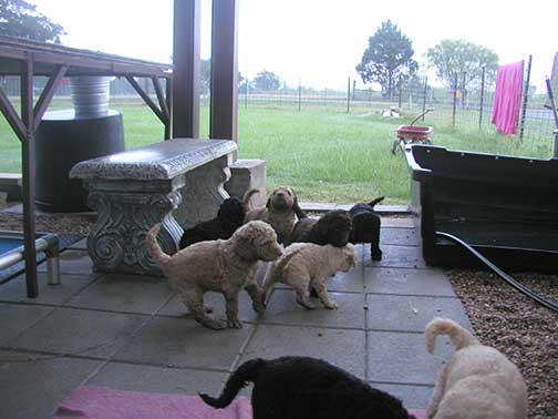 Follow along as Large Standard Poodles G x D pups reach and learn in the Blue Bonnet Park. Born August 2, 2020, ready for homes September 27, 2020. 6 Males + 4 Females = 10 puppies; 2 Reds, 4 Apr/Creams, 1 Black Males + 1 Brown, 2 Black, 1 Apr/Crm Female. Tes was TOTALLY surprised by the number of red, apricot/creams born! WOW! Usually black is dominant in such matings of brown to red.