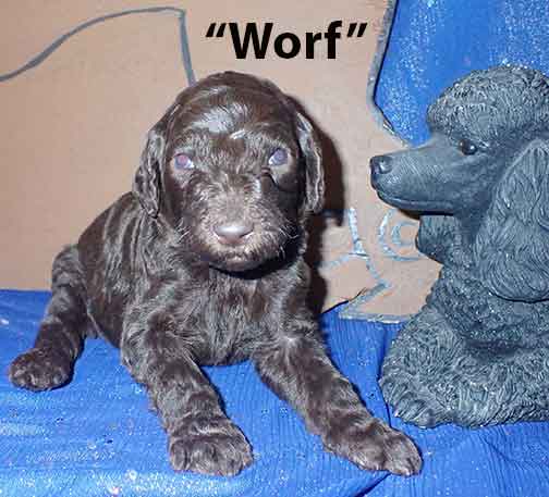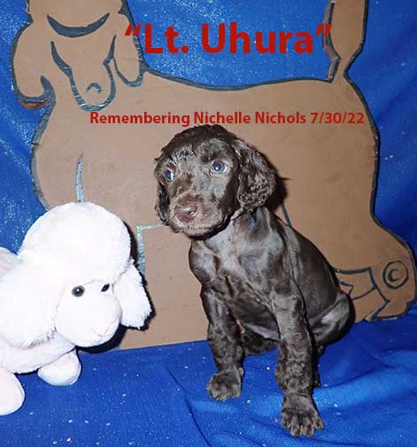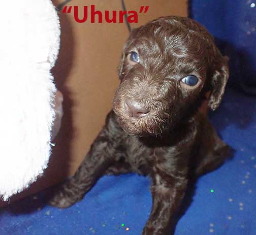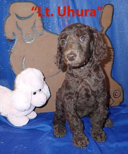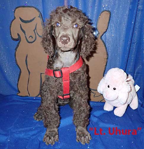 SOLD - "Lt. Uhura now Lieutenant?" - 9 wks old mc 3193; 10lbs 9oz; Brown. Lt. Uhura is going to be a "Standard Poodle". Estimated adult wt. 55 lbs? Absolutely a sweety ;o) In Star Trek Lt. Uhura was the first African Am/Black woman to play a lead roll on TV as the Lt. Communications Officer of Star Trek.