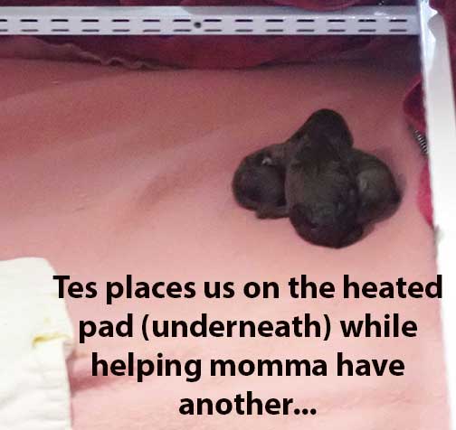 Here we keep coming and keep coming!!! Tes has to be right here pulling the sack off to get us breathing, rubbing us dry and momma licking us to get us breathing and moving around. We can't excrete on our own right away, so momma warms our groins by licking us and away we goooo.....