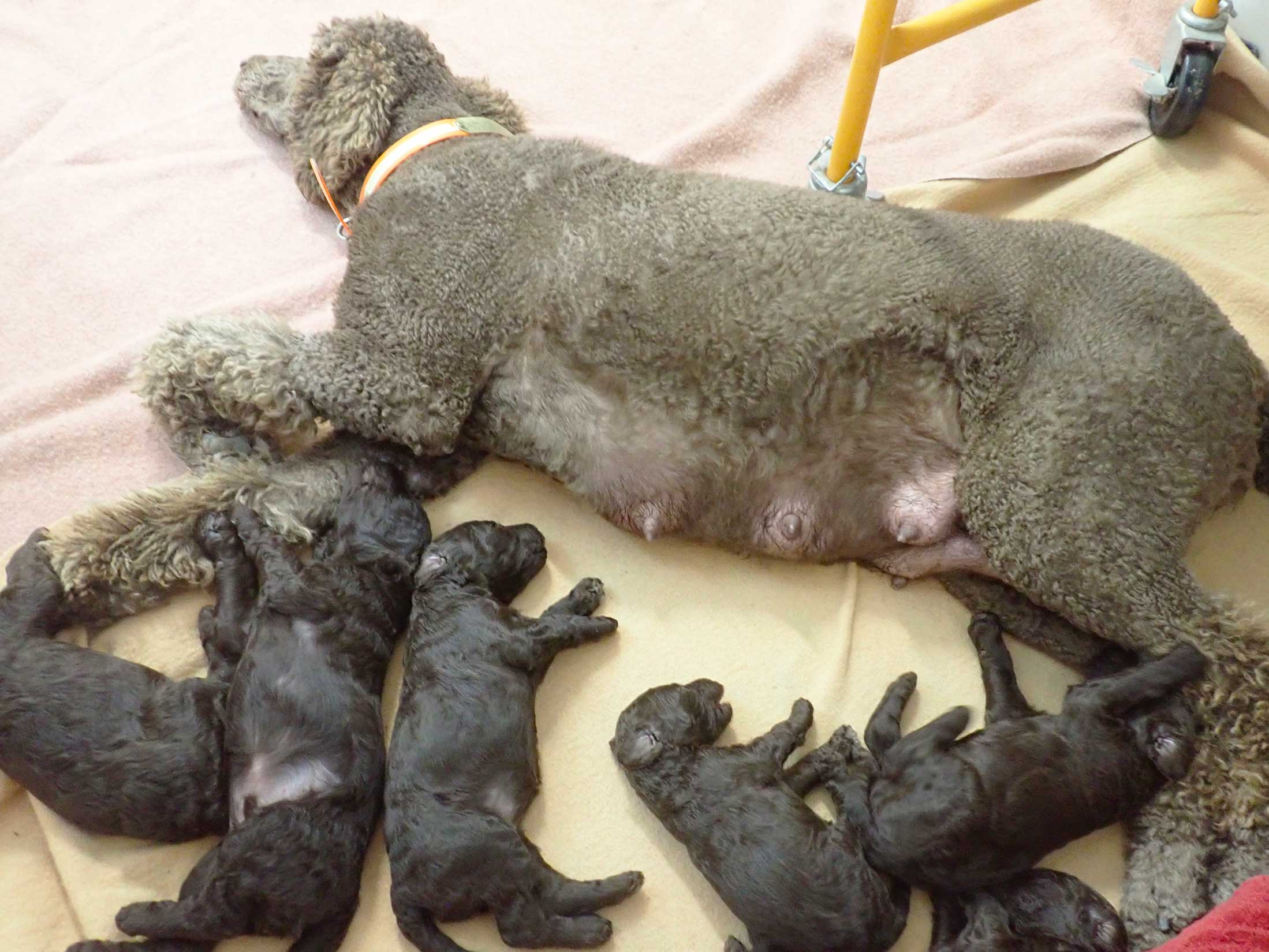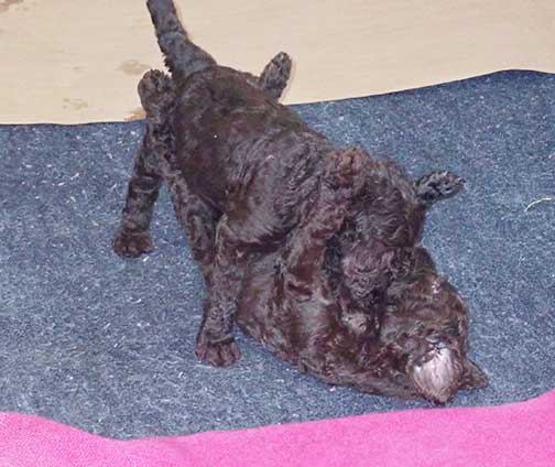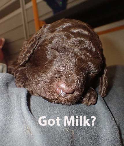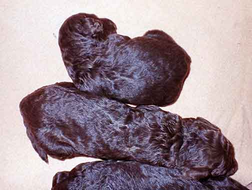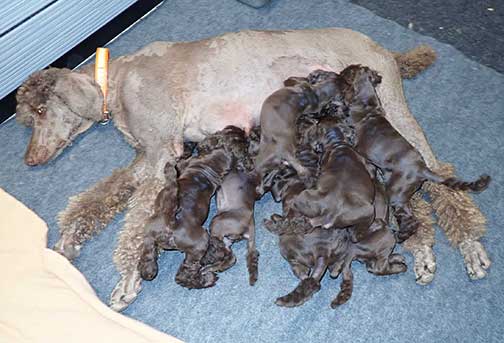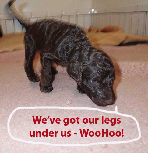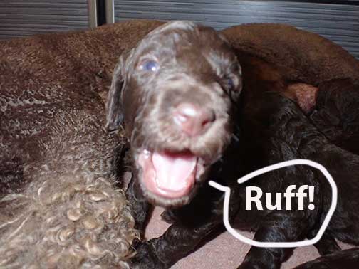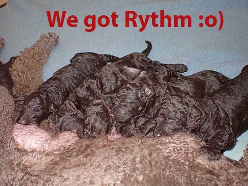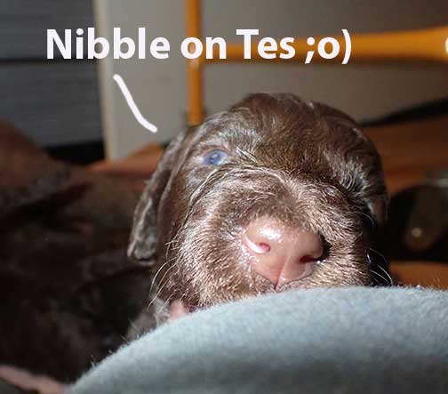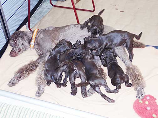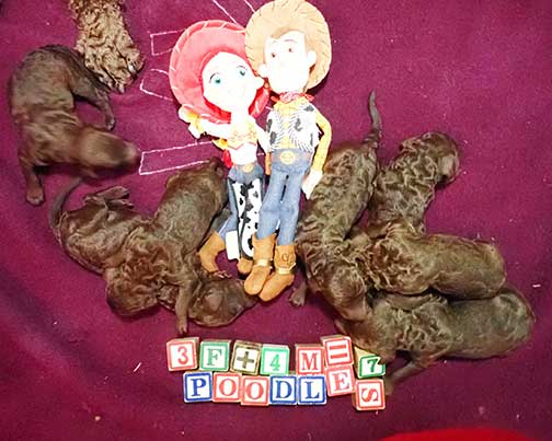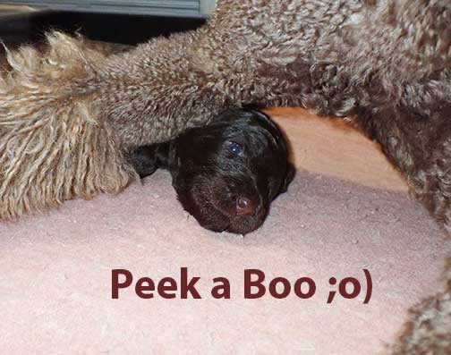 The next 3 wk picture update above for our web page Royal Brown Standard Poodles Geo x Bruno will show our eyes opening and starting to stand and move around...making a lot more music for Tes. Definitely getting ready to move into the Wing with 7 of us by 3 wks old. Tes will micro-chip us and have individual pictures for you to see :o)