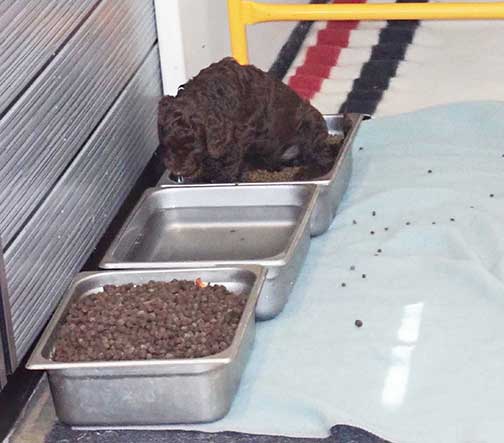 As we grow so fast, we're starting to get hungrier and needing more nutrients to not drain momma. Tes makes us up a slurry made from Purina puppy Mousse, thins it out with water and adds dried ground lamb dog food. She likes Health Extension Lamb kibble to get our sensitive tummies going. Over 18 yrs of breeding, this has become the protocol to avoid diarrhea from just the canned mousse (ALWAYS had diarrhea with only canned) then in adding the dried grounded kibble it made their stools nice that they no longer have swollen sensitive anal areas from the loose stools irritating them. SOOOO MUCH healthier as their intestinal track develops!
