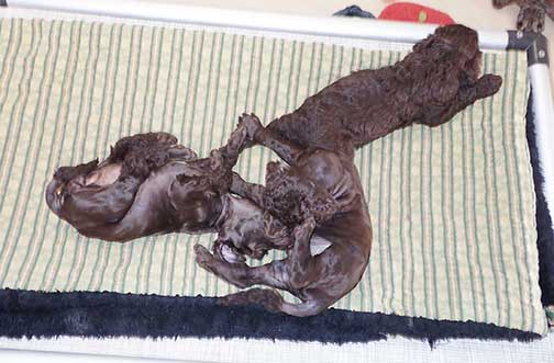 A litter of ALL Brown puppies (I don't see any white mismarks on toes, chest, or chins) from Royal Brown Standard Poodles Geo x Bruno. I will never be able to share definitely if one will be a holding brown or fading. I've seen a holding brown sister, vss Cairo who faded from the same litter. Momma Geo is a holding brown, Bruno was a faded brown.