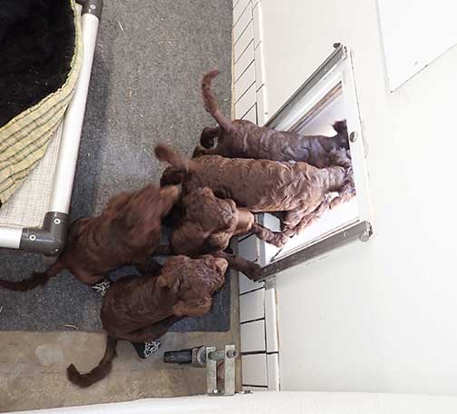 Remember to start at the bottom of the web page and scroll up to watch us Royal Brown Standard Poodles Geo x Bruno puppies for sale grow up onto the page, as pictures are added upward every two weeks :o) Tes does her best to share what is done as a breeder in growing us up for you. Having 7 is a nice litter so Tes wants to assure all stay healthy as well as keeping momma Geo fit for caring for us.