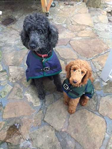 Two poodles straining