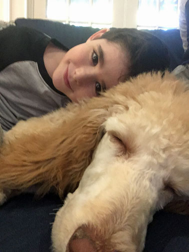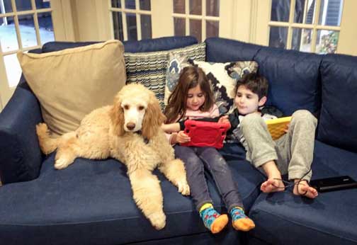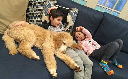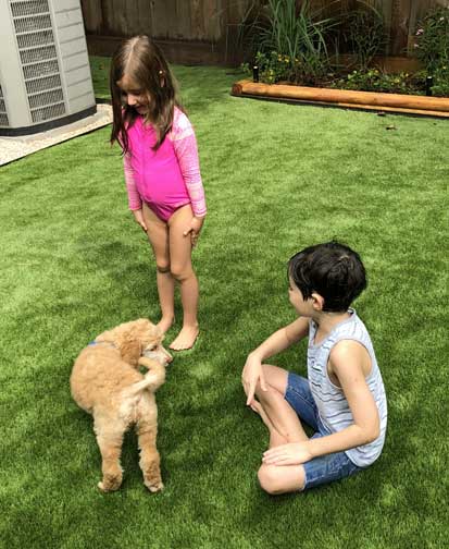 The kids LOVE her! Winnie’s still a bit crazy when people come over. Almost no jumping (we had a great trainer) but she has no concept of personal space and no off switch and likes to run full speed at everyone with a loving (but hard) body check. She also likes to mouth on people’s hands, not bite, just a ‘hey, you aren’t paying enough attention to me’. That just means that the kids take friends up to their room or the playroom and close the door to keep Winnie out (away from their friends and away from small toys she’d otherwise eat...or play keep away with). Overall it’s nice and relaxing for me and Winnie downstairs during play dates...I sure do miss play dates! (March Covid 19) I tell everyone that my biggest problem is that Winnie loves all the humans...a bit too much sometimes.
